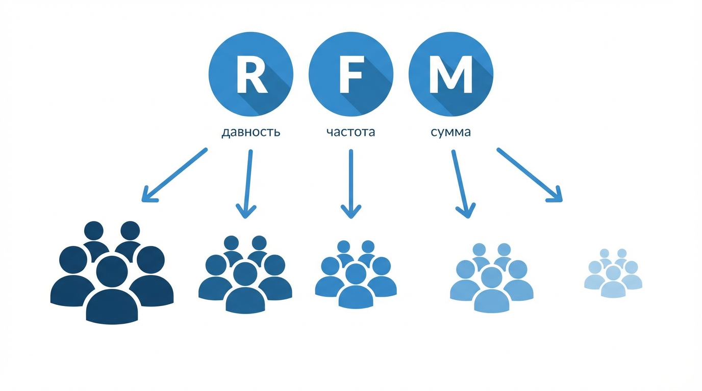 Пример: Интернет-магазин рассылает одинаковую скидку 10% всей базе в 15 000 клиентов. VIP-клиент с чеком 200 000 рублей получает ту же скидку, что и одноразовый покупатель за 500 рублей. Первому скидка не нужна — он и так лоялен. Второй все равно не вернется. А клиент, который покупал 3 раза за последний год и пропал 2 месяца назад, не получает вообще никакого внимания. RFM-анализ решает эту проблему: каждый сегмент получает свою стратегию.